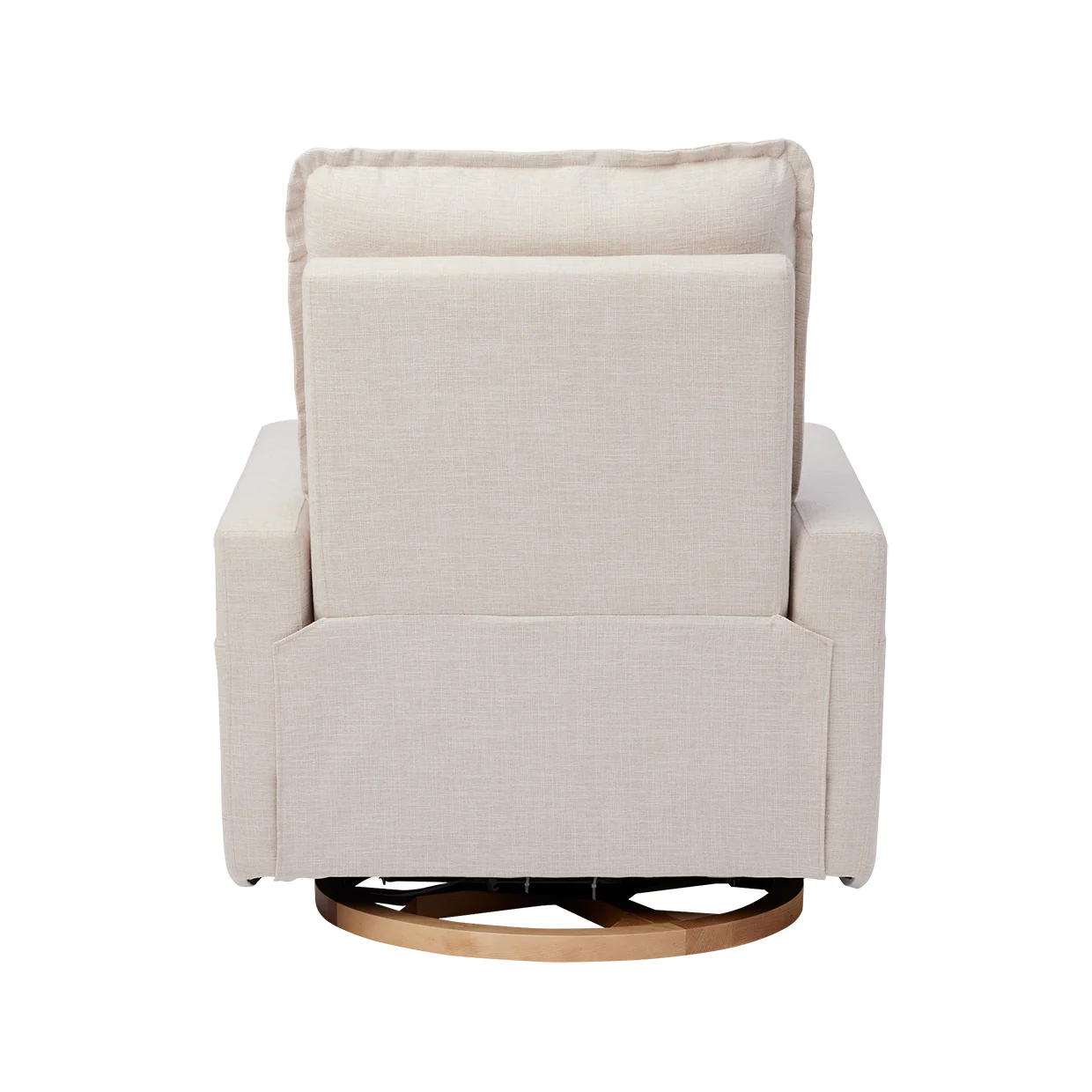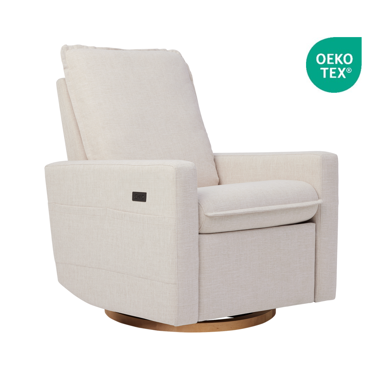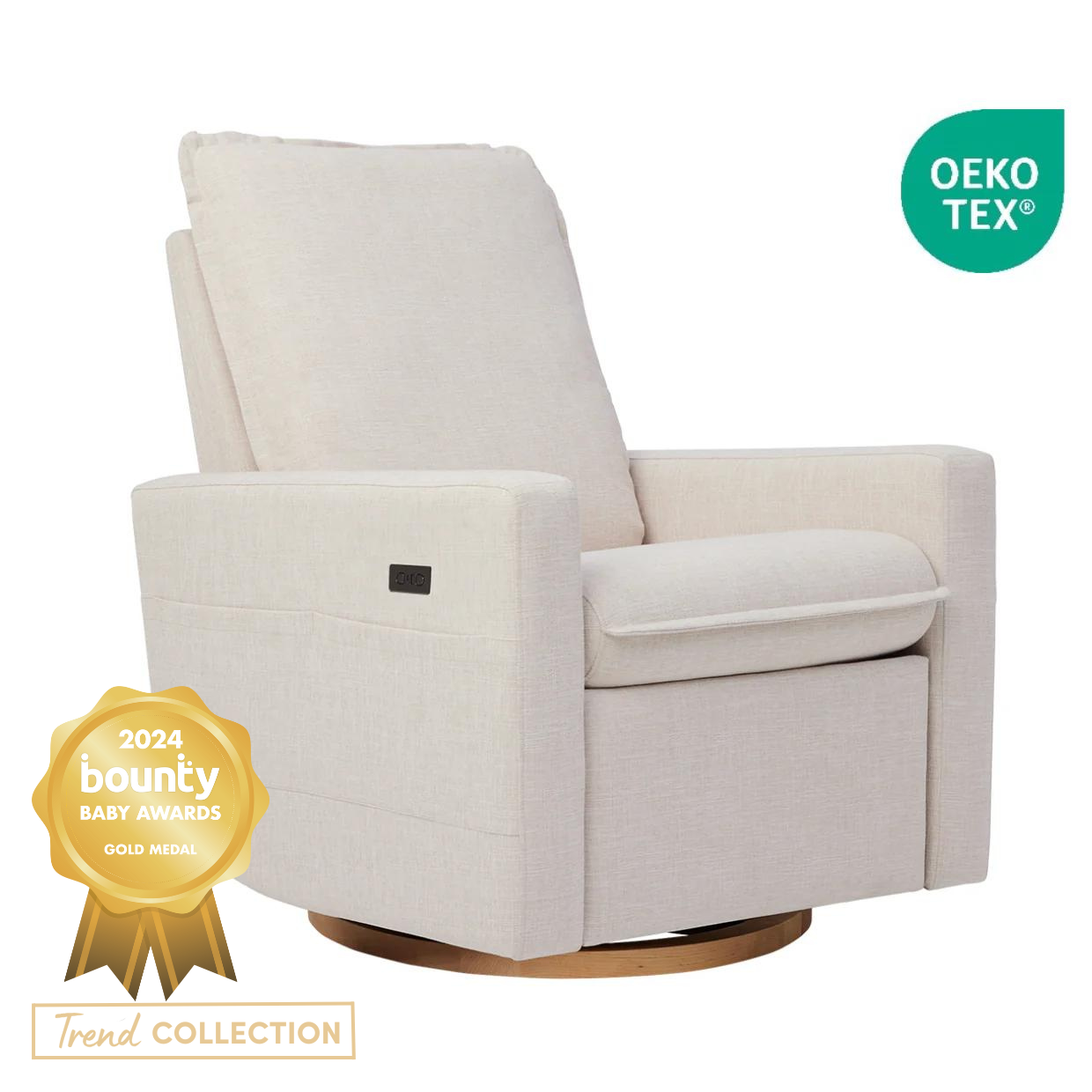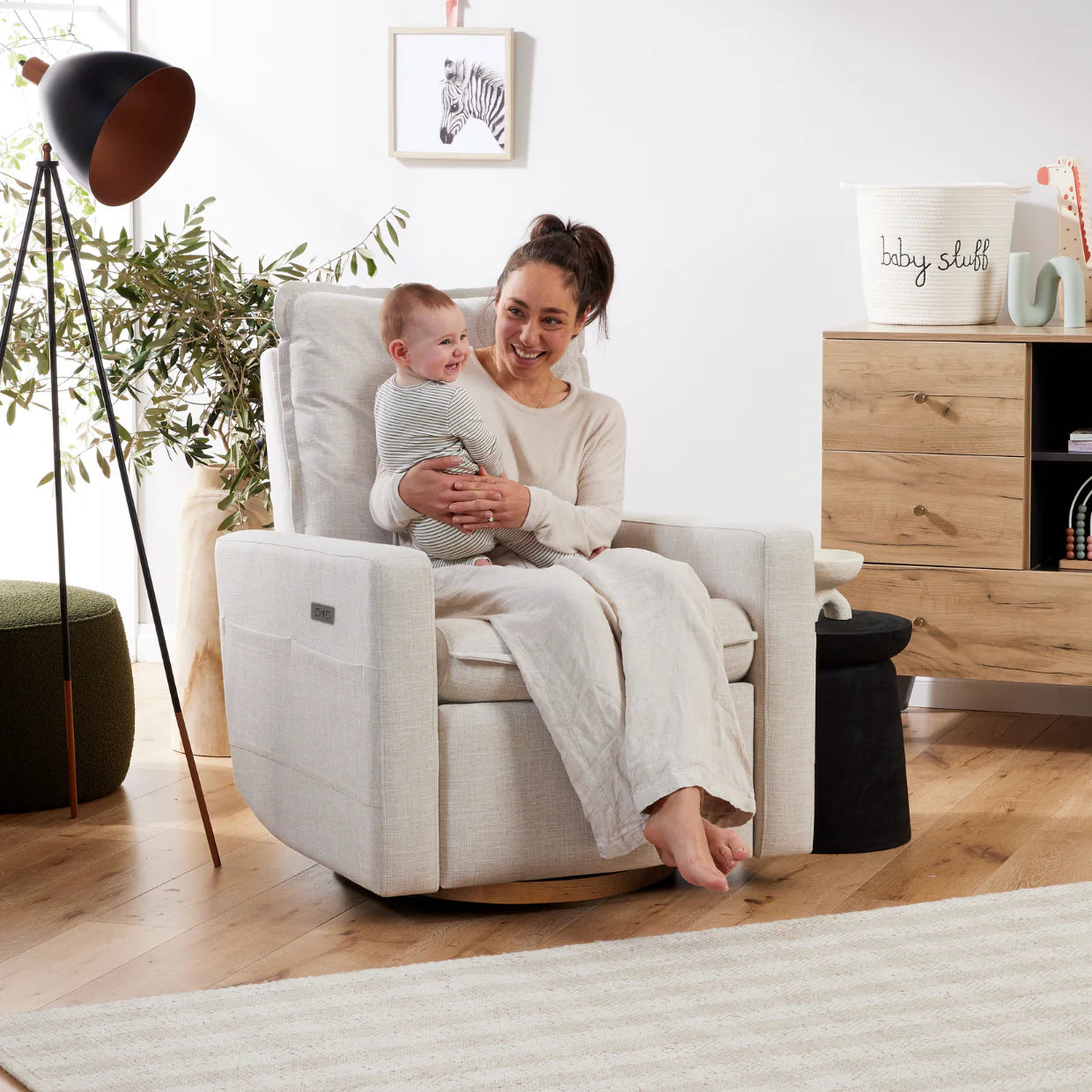 This trend-setting Il Tutto nursery glider chair is designed with a stylish wooden base elevating the aesthetic of your nursery. Like all iL Tutto Nursing chairs, the Frankie Electric Recliner Nursery Chair goes beyond offering only aesthetics, featuring a 180-degree swivel for hands-free convenience, an electric recline with USB A and C charging points, and a gentle glide to soothe both you and bubs. The ergonomic design provides optimal support for the feeding parents, complemented by a tall backrest and an included lumbar cushion.