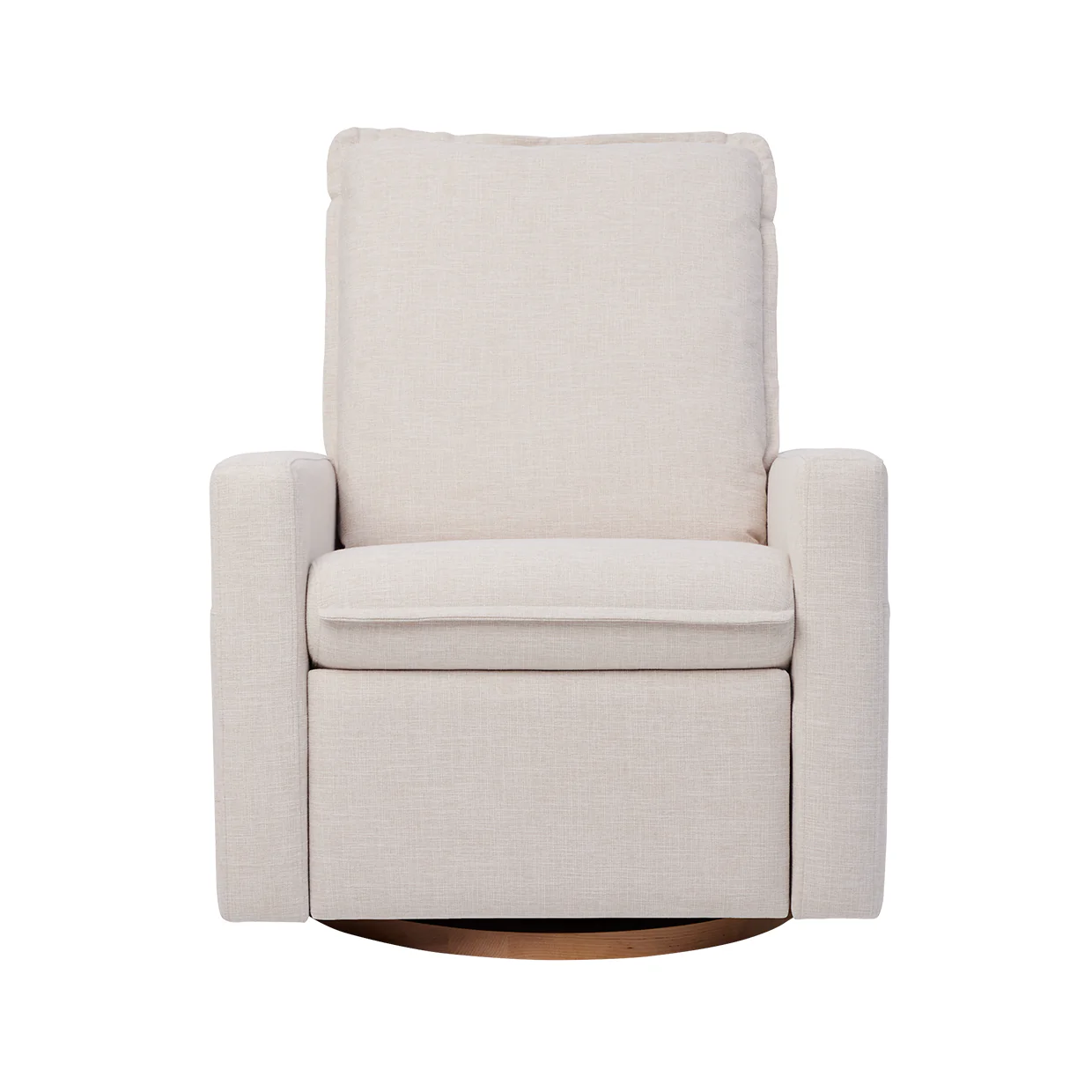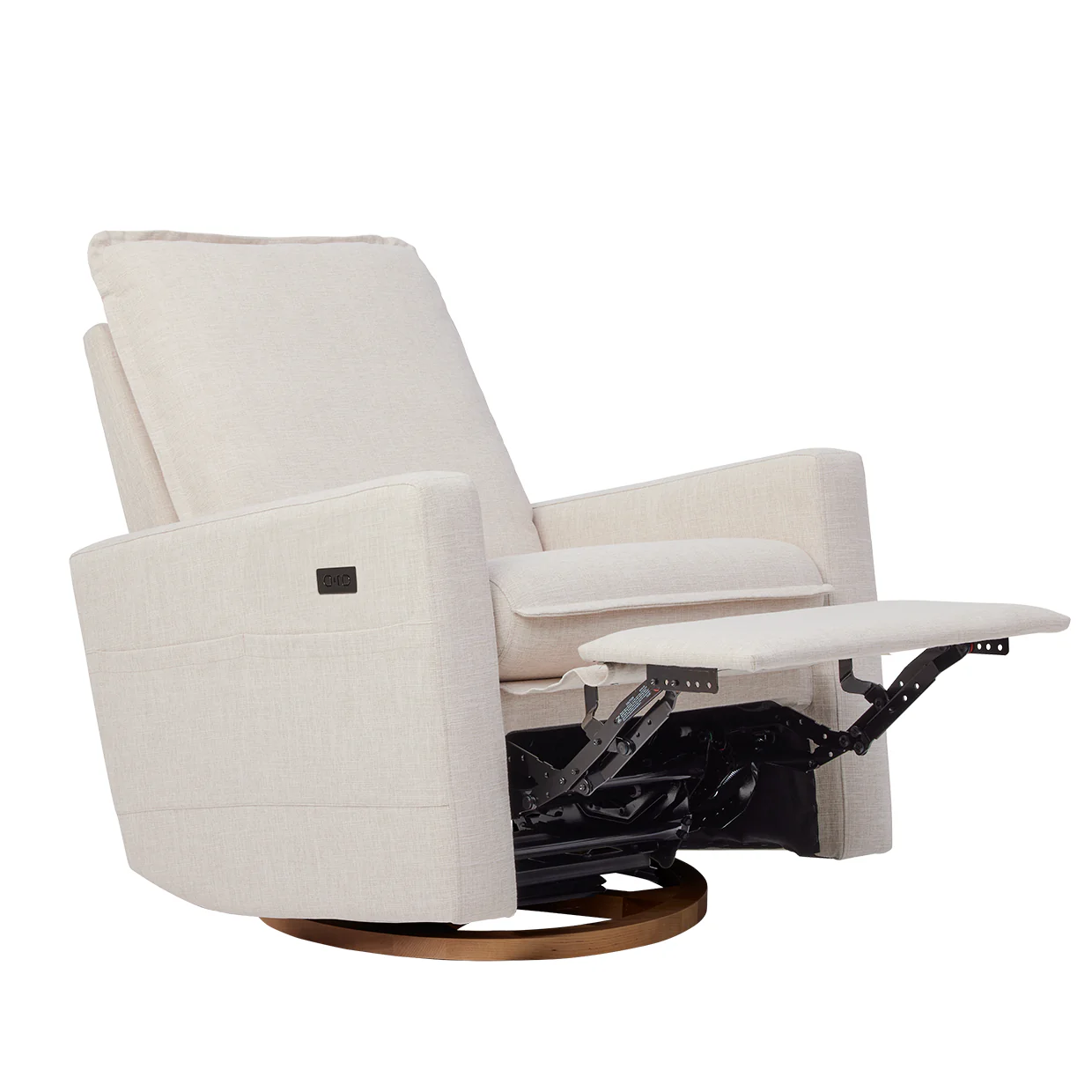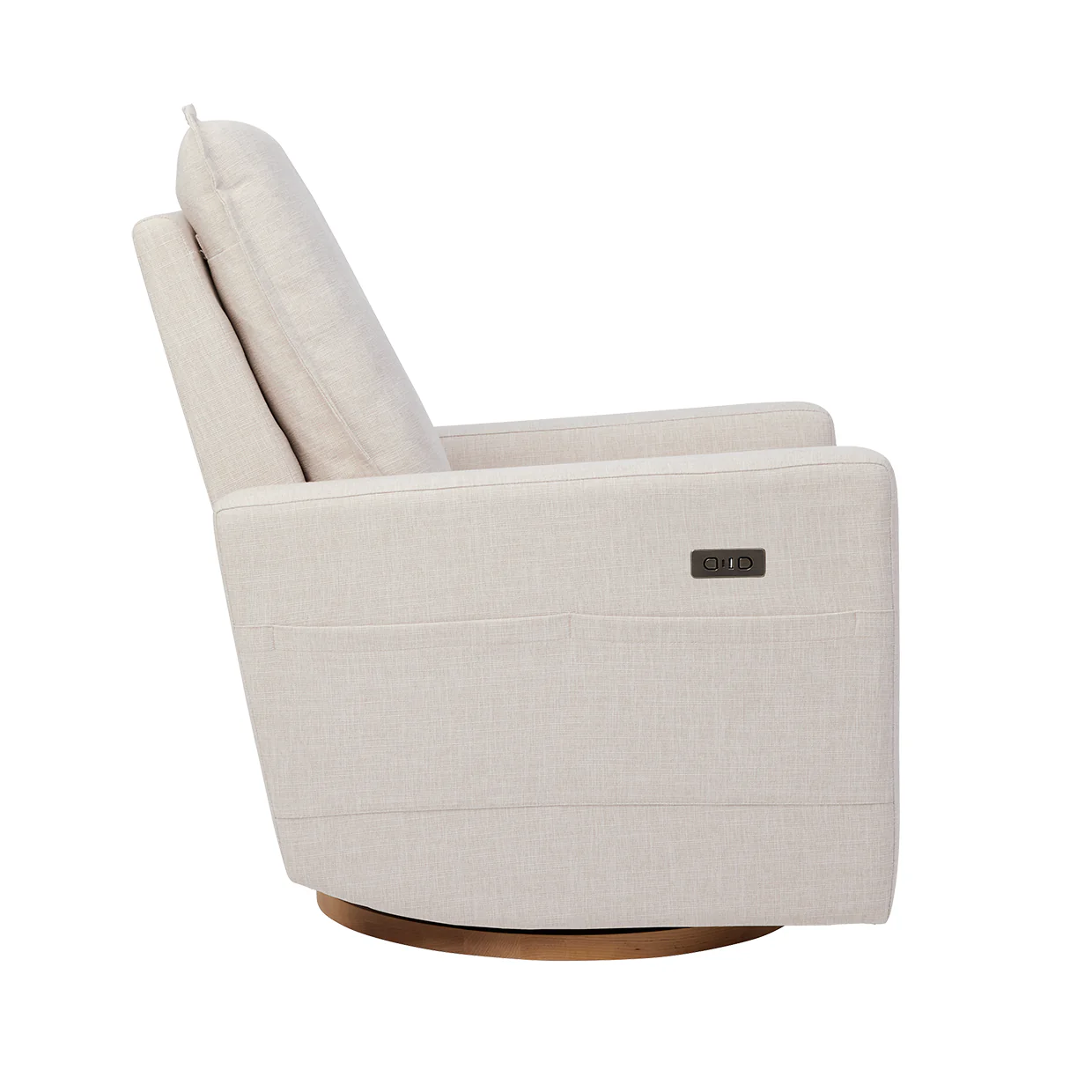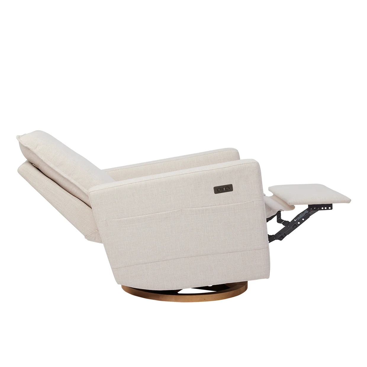 This trend-setting Il Tutto nursery glider chair is designed with a stylish wooden base elevating the aesthetic of your nursery. Like all iL Tutto Nursing chairs, the Frankie Electric Recliner Nursery Chair goes beyond offering only aesthetics, featuring a 180-degree swivel for hands-free convenience, an electric recline with USB A and C charging points, and a gentle glide to soothe both you and bubs. The ergonomic design provides optimal support for the feeding parents, complemented by a tall backrest and an included lumbar cushion.