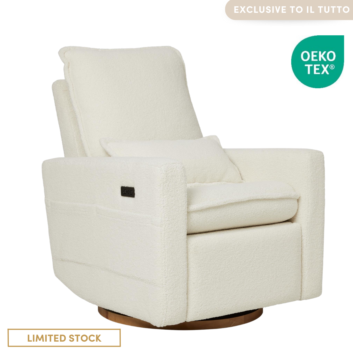 This trend-setting Il Tutto nursery chair is designed with a stylish wooden base elevating the aesthetic of your nursery. Like all iL Tutto Nursing chairs, the Frankie Electric Recliner Nursery Chair goes beyond offering only aesthetics, featuring a 180-degree swivel for hands-free convenience, an electric recline with USB A and C charging points, and a gentle glide to soothe both yours and bubs body. The ergonomic design provides optimal support for feeding parents, complemented by a tall backrest and an included lumbar cushion.